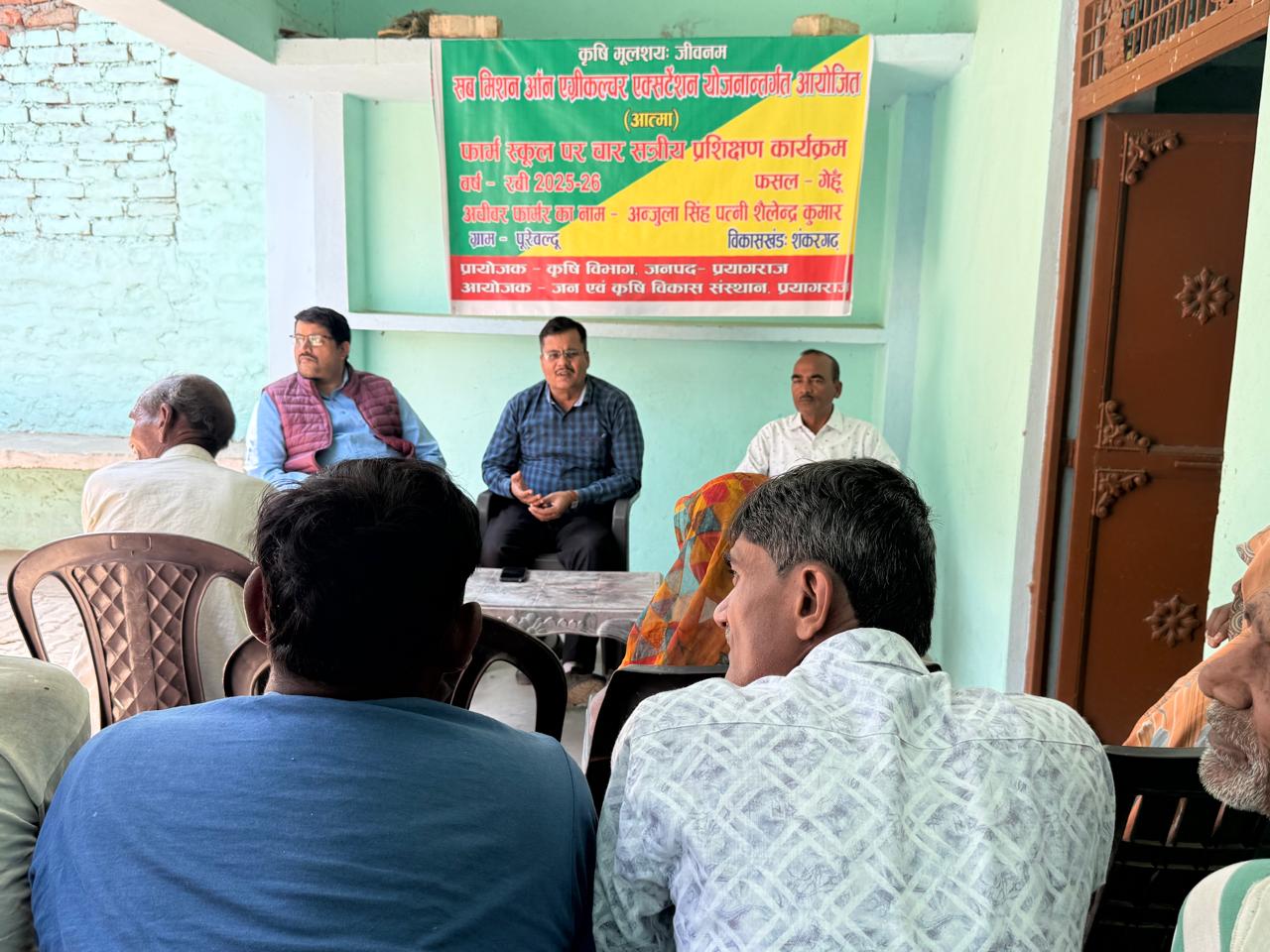 Prayagraj: Under the Aatma Yojana (ATMA) scheme, the Jan Evam Krishi Vikas Sansthan organized a four-session training program at the Farmer Field School for wheat in the Jasra and Shankargarh development blocks. During the training, Dr. T.D. Mishra, Scientist, SUATS, Naini, provided detailed information on crop disease management. He explained how farmers can use various methods to protect their crops from diseases. Institute experts Pradeep Singh, Akhilesh Mishra, and Ramvilas Patel were present. They also informed farmers about crop disease management and the latest agricultural techniques. During the program, farmers asked questions to the experts and shared their experiences. Such programs will help farmers increase their crop productivity.