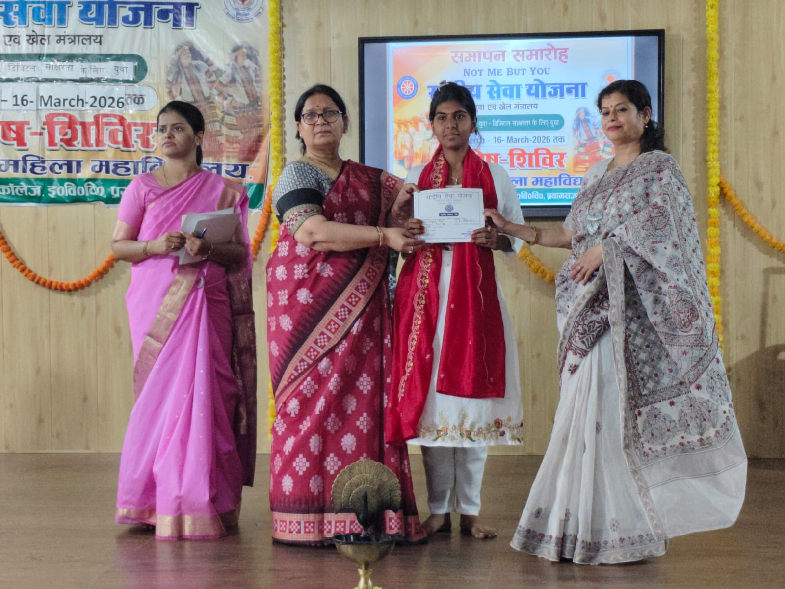 Prayagraj: The closing ceremony of the seven-day special camp of National Service Scheme Unit 055, organized from March 10 to 16 at Rajarshi Tandon Mahila Mahavidyalaya (RTMM), a constituent of Allahabad University, concluded on Monday. The closing ceremony began with the lighting of lamps and Saraswati Vandana. Mayuri performed a dance performance based on Ganesh Stuti. Vaishnavi, Meenakshi, Lakshmi, Soumya, and Anu then presented a captivating folk song, “Hamara Seema Ke Jawanwa.”