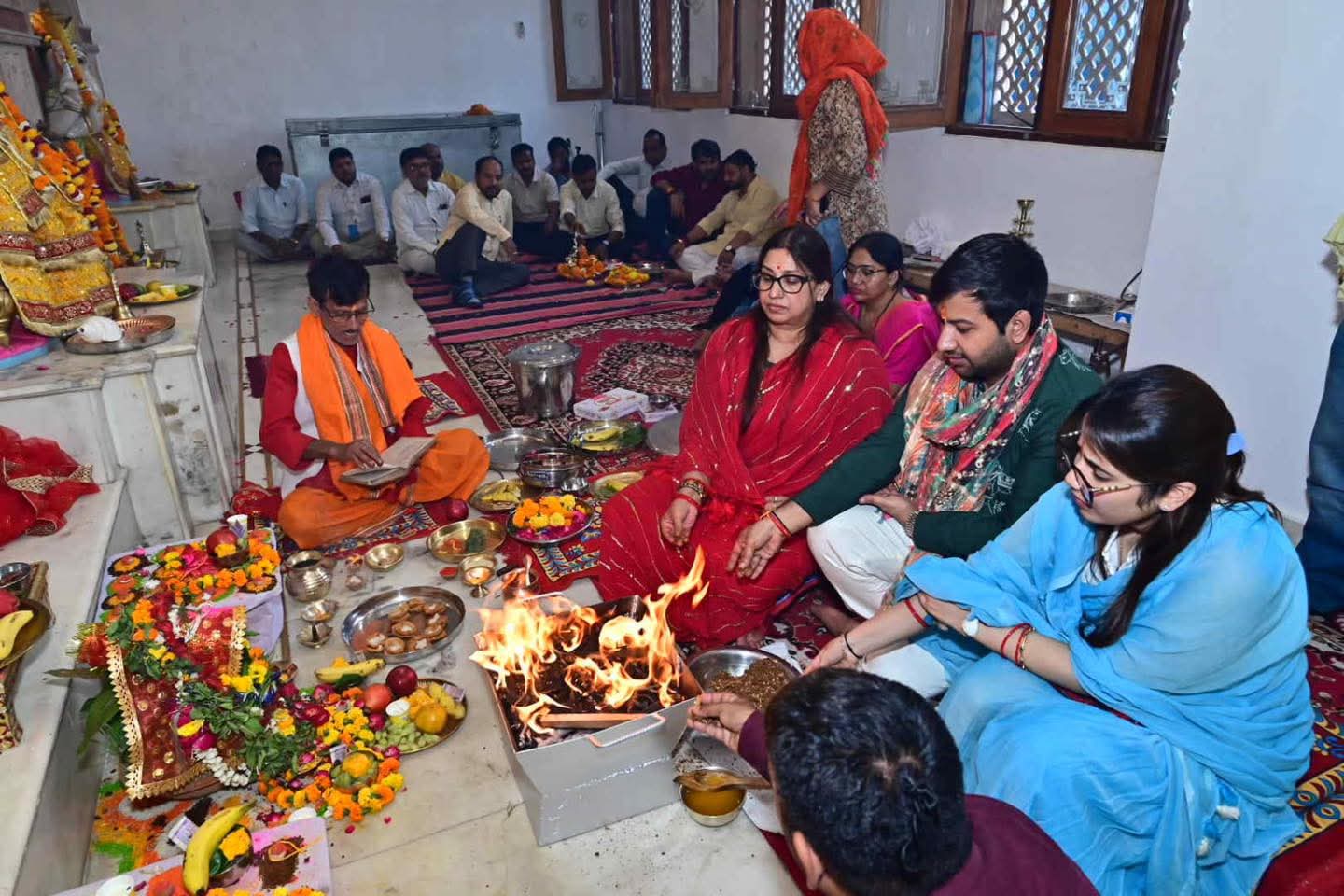 Prayagraj|: On Thursday, on the occasion of the Navami Tithi of Chaitra Navratri, former Mayor of Prayagraj, Abhilasha Gupta Nandi, along with her family, performed Kanya Pujan with all the rituals at her residence in Bahadurganj. She washed the feet of unmarried girls with water from a pot in a brass plate. Applied color on their feet. At the same time, after applying tilak of roli, sandalwood, curd, Akshat on their forehead and covering them with a chunari, she received blessings by giving gifts and Dakshina. Performed Aarti and served food with her own hands while receiving their blessings. Before Kanya Pujan, she praised the Goddess and offered oblations in the havan kund.