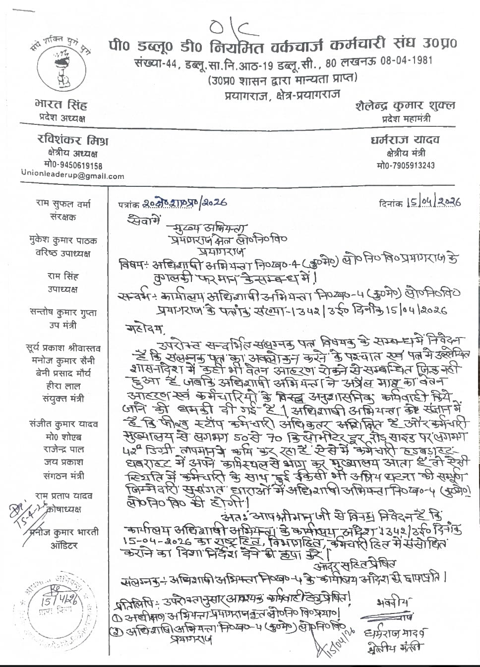 Prayagraj: How will illiterate peons, watchmen, boatmen etc. holders of posts run Mission Karmayogi? The office order of the Executive Engineer, Construction Block 4, Kumbh Mela, Public Works Department, Prayagraj, in which pressure was put on all Class IV employees for Mission Karmayogi training and they were threatened that the salaries of those employees who do not submit will be withheld for the month of April. Opposing this office order, Ravi Shankar Mishra, Divisional President of PWD Regular Work Charge Employees Union, complained to the Chief Engineer and pleaded that the Tughlaq decree of the Executive Engineer should be amended and the order should be passed in the national interest, department interest and employee interest. While the Executive Engineer knows that the holders of posts like Beldar, Chowkidar, Mallah etc. are illiterate and uneducated, they do not have mobile phones and if they have, then it is a keypad. How will they operate Mission Karmayogi? There is no order to withhold the salaries of the employees anywhere in the government order. The Executive Engineer is carrying out work beyond the government order. Not only this, the employee is working in 43°C temperature on the roadside, about 50 km away from the headquarters. He will come to the headquarters in a panic due to the fear of salary deduction and if someone is with him, he will come in a hurry. If any untoward incident occurs, the responsibility will be of the Executive Engineer, Construction Block 4, Kumbh Mela, and the Union will be bound to take action under the relevant section.