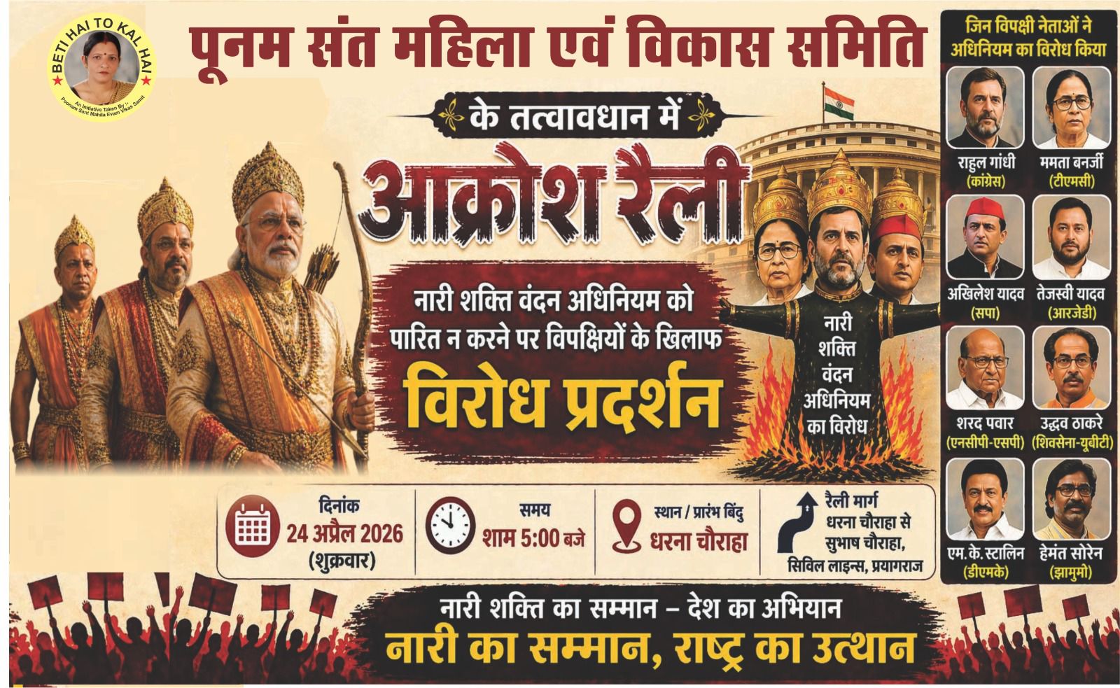 Prayagraj: The Madhya Pradesh unit of the Poonam Sant Mahila Evam Vikas Samiti is organizing an “Aakrosh Rally and Protest Demonstration” on April 24, 2026, at 5:00 pm at Dharna Chowraha, Civil Lines, Prayagraj, to protest the non-passage of the Nari Shakti Vandan Act. The rally will be held from Dharna Chowraha to Subhash Chowraha, Civil Lines, Prayagraj, and will be attended by hundreds of women, committee members, office bearers, and dignitaries, informed Abhishek Sant, National Secretary, Poonam Sant Mahila Evam Vikas Samiti
